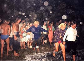 Говорить об этих удивительных созданиях можно долго, допустив их существование, подумаем, кому выгодны эти твари – оценим явление под «глубинным» углом зрения. Многие учёные подтверждают существование «скрытых сил природы» или допускают их участие в различных энерго-информационных процессах в окружающей среде (смотри пояснение учёных ниже по тексту). Перуницы просто универсальный инструмент для вмешательства в земные дела, они незаменимы в агитаторской работе лунных комиссаров. К примеру: когда господин бог ловит новых адептов в обновлённые сети или погоняет своих двуногих овец, он обязан творить маленькие чудеса, – хождение по углям именем Господним, – это серьёзный аргумент для рождения веры (первое фото). Перуницы по приказу Судьбы, забирают излишки плазмы с тела ходящих по углям людей, охлаждая их. (Например, когда рядом находятся невидимые активные перуницы и взаимодействуют с телом, становится холодно, по телу идут мурашки, разряжаются батарейки у фонарей и часов, сбоит различная аппаратура, особенно компьютерная техника). Волею Судьбы дополнительная плазма вокруг тела людей появляется путём конвертирования инфракрасного и теплового спектра излучения (инфракрасные фотоны) – в ауру электростатических зарядов. Когда перуницы отбирают энергию (поглощают) они белые или голубоватые, когда они бодрят публику, подкачивая заряды, модулированные специфической информацией (излучает), то цвет их красноватый. На второй фотографии видны перуницы-витоны во время схода (излучения) плазменной благодати от бога в религиозной общине. На третьем фото недоношенные шаровые молнии обсасывают молодых казаков демонстрирующих боевые приёмы. (Дополнительные фотографии перуниц-витонов в приложении на диске).