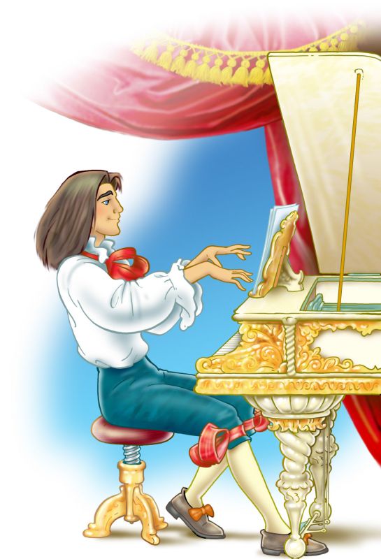 За белым роялем, инкрустированным перламутром, сидел сам Маэстро в белоснежной рубашке с кружевными манжетами и жабо. Его длинные завитые волосы были присыпаны пудрой, шею прикрывала красная шёлковая лента, а у колен были завязаны два банта.