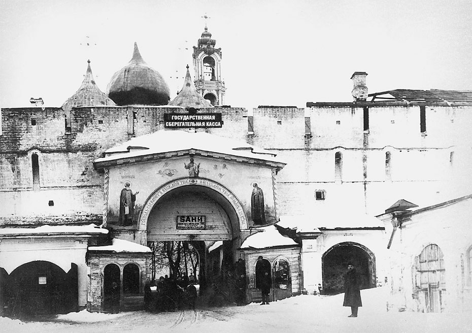 Над святыми вратами Лавры таблички с надписями «Бани» и «Государственная сберегательная касса»; после 1918 г.