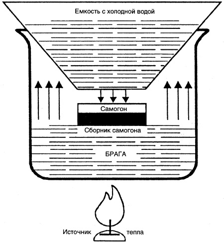 Чугунок с бражкой накрыт сверху вторым чугунком, в котором установлена мешалка и пароотводная трубка, соединенная с холодильником. Спиртосодержащие пары конденсируются в холодильнике и стекают в приемник. Место соприкосновения чугунков замазывается тестом.