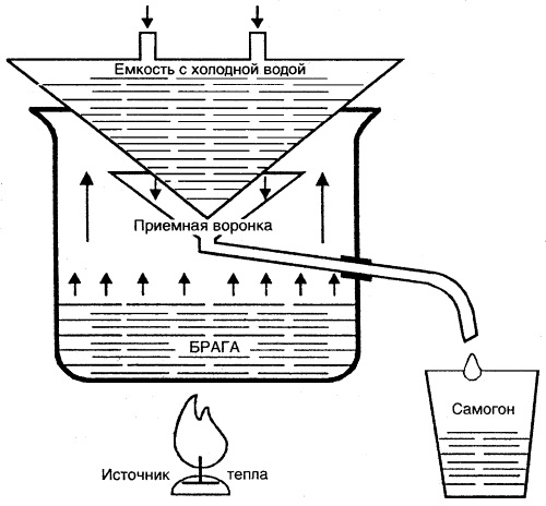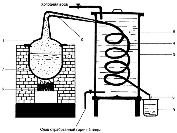 Устройство перегонного куба несложное: медный сосуд (1), напоминающий огромный чайник с круглым дном и горлом, соединенным длинной трубой (2) с конденсатором (3). Конденсатор представляет собой медный змеевик (4), погруженный в емкость, где циркулирует холодная вода (5). Когда перегонный куб подогревают на открытом огне (6), бражка (7) кипит и пар попадает в змеевик, в нем пар конденсируется и превращается в жидкость, которая стекает тонкой струйкой (8) в приемную тару (9).