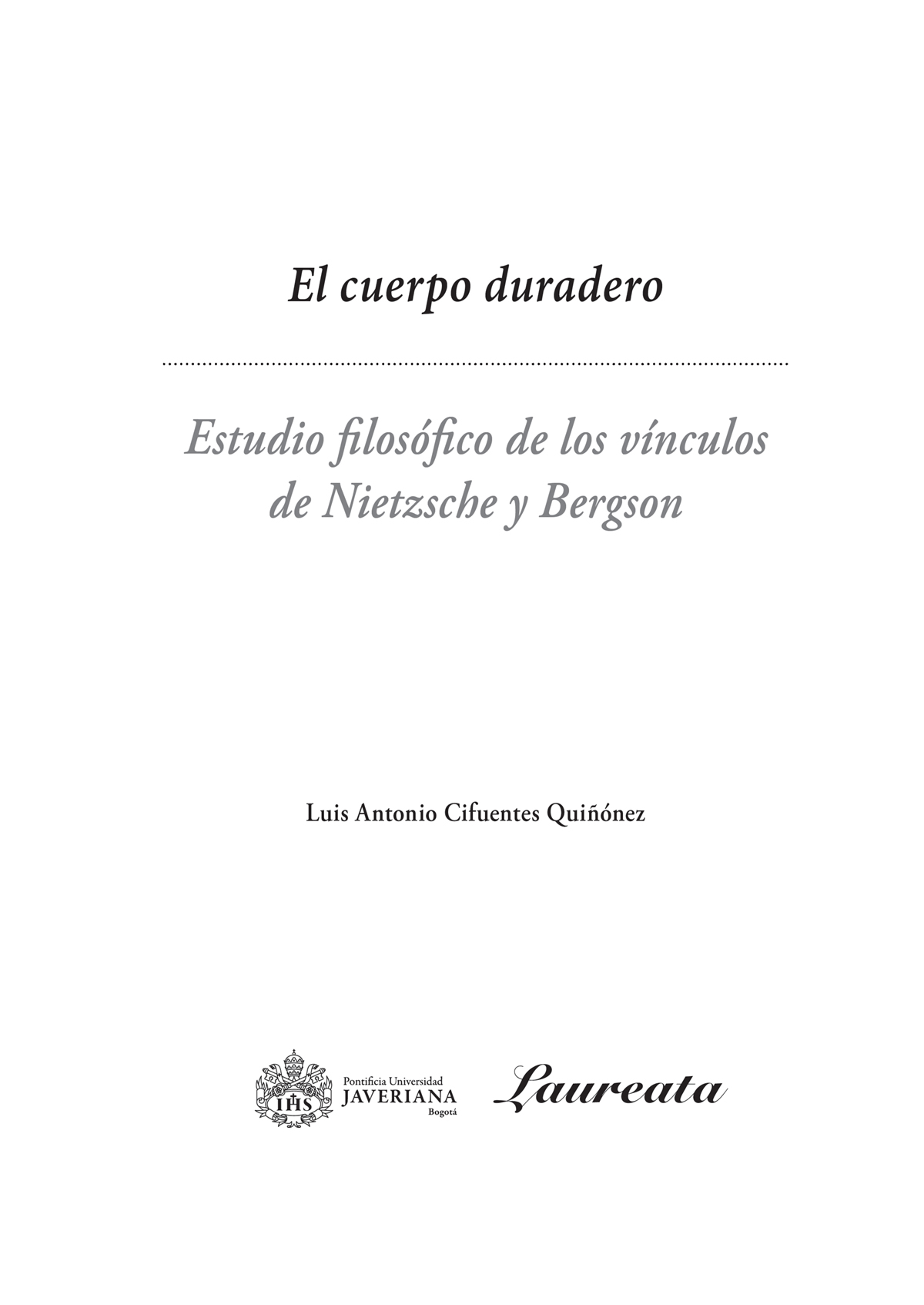 El cuerpo duradero : estudio filosófico de los vínculos de Nietzsche y Bergson / Luis Antonio Cifuentes Quiñónez. -- Primera edición. -- Bogotá : Editorial Pontificia Universidad Javeriana, 2019. (Colección Laureata)