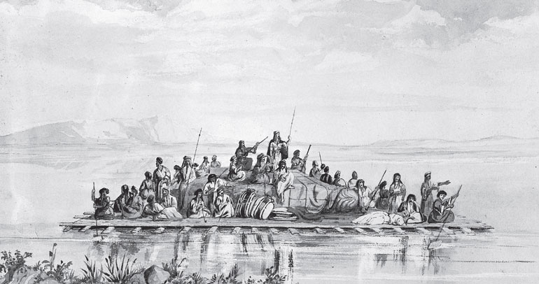 Рис. 1.3. Англичанин Остин Генри Лейярд переправлял свои ассирийские находки из Древней Ниневии по реке Тигр на деревянных плотах, которые для усиления устойчивости и плавучести дополняли сосудами из козлиных шкур, наполненных воздухом. Когда плот достигал Персидского залива, то воздух выпускали, сосуды отправляли обратно на ослах, а деревянные конструкции продавали. Сами ассирийцы пользовались похожими речными судами
