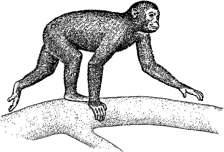Проконсул – это человекообразная обезьяна, жившая 18 млн лет назад в Африке, на озере Виктория. Ростом он был с собаку (от 10 до 37 кг). Около 15 млн лет назад проконсул благополучно вымер. От общего ствола предков этот вид отделился после гиббоновых, но до понгид. Мы с детства слышим о том, что человек произошел от человекообразных обезьян, которые в наше время представлены на Земле понгидами – орангутаном, гориллой и шимпанзе. В них-то мы и всматриваемся, пытаясь найти сходство с человеком. Но эти обезьяны – современные виды, они прошли (после того как отделились от общего с человеком ствола) свой путь эволюции, не меньший, чем у человека, но направленный в иную сторону: сначала освоили брахиацию (перепрыгивание с ветки на ветку, раскачиваясь на руках), а потом (горилла и шимпанзе) хоть и спустились с деревьев, но остались тесно с ними связанными. Из-за брахиации у них длинные руки и короткие ноги, а у нас – наоборот. Способность к брахиации у человека атавистическая: сразу вдруг нам с ветки на ветку не перепрыгнуть, но после упорной тренировки многим это удается (вспомните, как летают воздушные гимнасты в цирке).