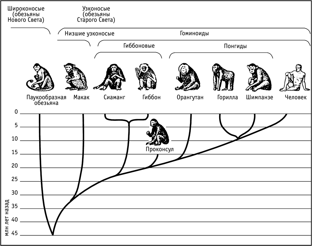 Ветвь приматов, давшая начало человеку, и место на ней проконсула. Время расхождения групп и видов (в месте ветвлений) дано на шкале слева.