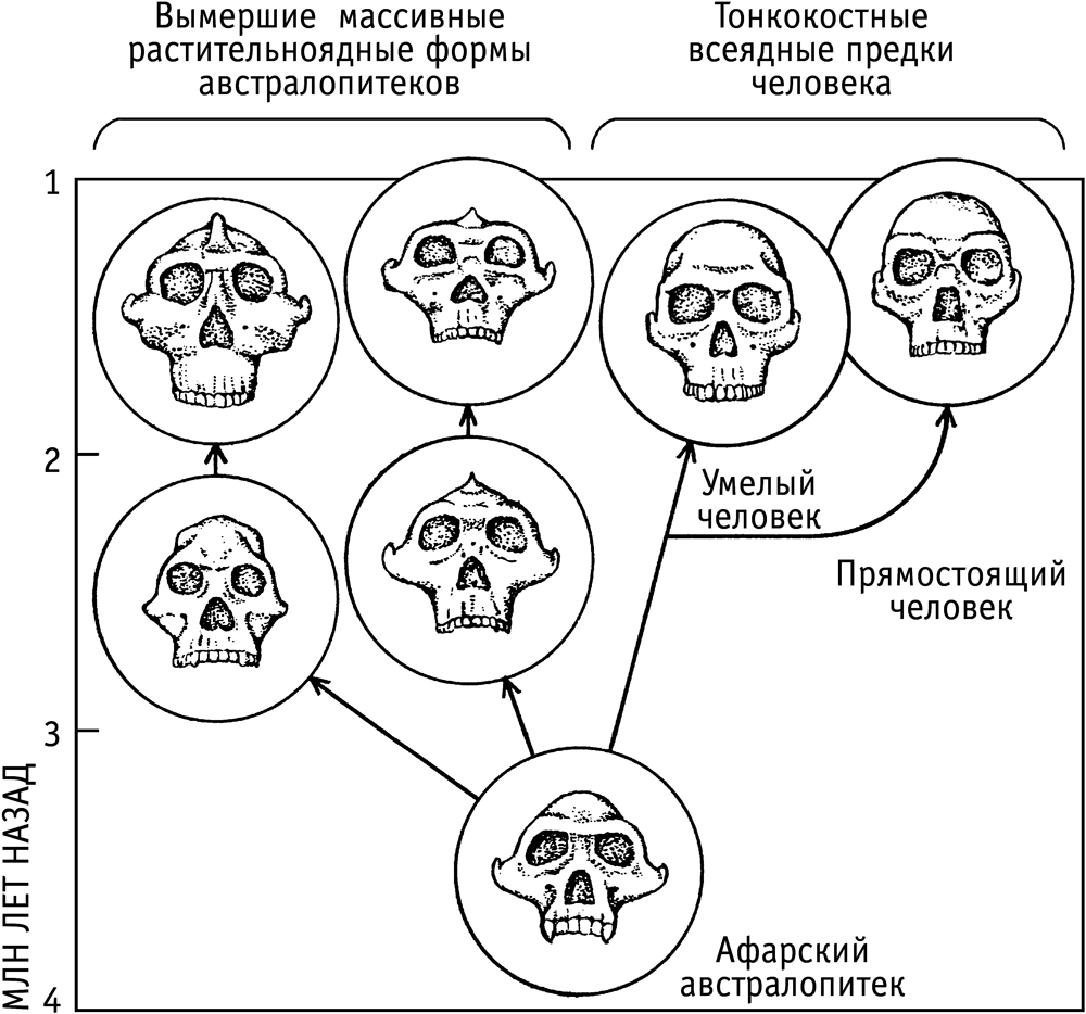 Приспосабливаясь к питанию грубой растительной пищей, часть потомков Люси 2,8 млн лет назад дала начало новому виду, более мощному, с укороченными клыками, – африканскому австралопитеку. От него 2,3 млн лет назад – еще один вид. Все эти австралопитеки «решали» свои эволюционные задачи «силовым методом»: зубы у них были крупные, челюсти мощные, могучая жевательная мускулатура прикреплялась к крепкому гребню на черепе. Сами они были очень большими, так что хищникам с ними было справиться непросто. Каменных орудий они не употребляли. Мозг их за 2 млн лет не увеличился. Словом, жили по принципу: «сила есть – ума не надо».