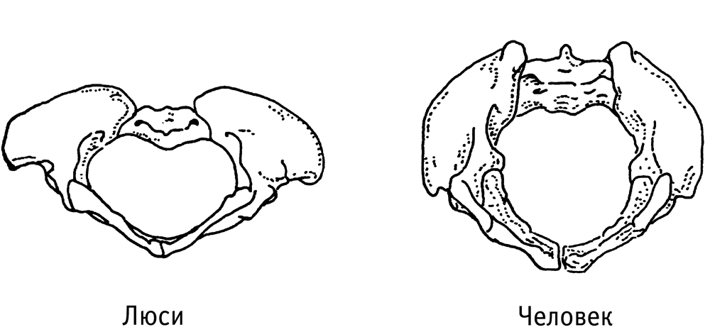 Когда изучили скелет Люси, выяснилось, что ходила она на двух ногах не кое»как, а полностью выпрямившись. «Конструкция» Люси непригодна для хождения на четвереньках и лазанья по деревьям. «Она не просто умела ходить на двух ногах, но это был для нее единственный способ передвижения», – такой вывод недавно сделал анатом К.О. Лавджой после тщательного изучения всего ископаемого материала. Более того, таз Люси, если сравнить его с тазом современной женщины, был лучше приспособлен к прямохождению, потому что он был уже. А чем таз уже, тем легче бегать. Но при узком тазе можно рожать детей только с небольшой головой!