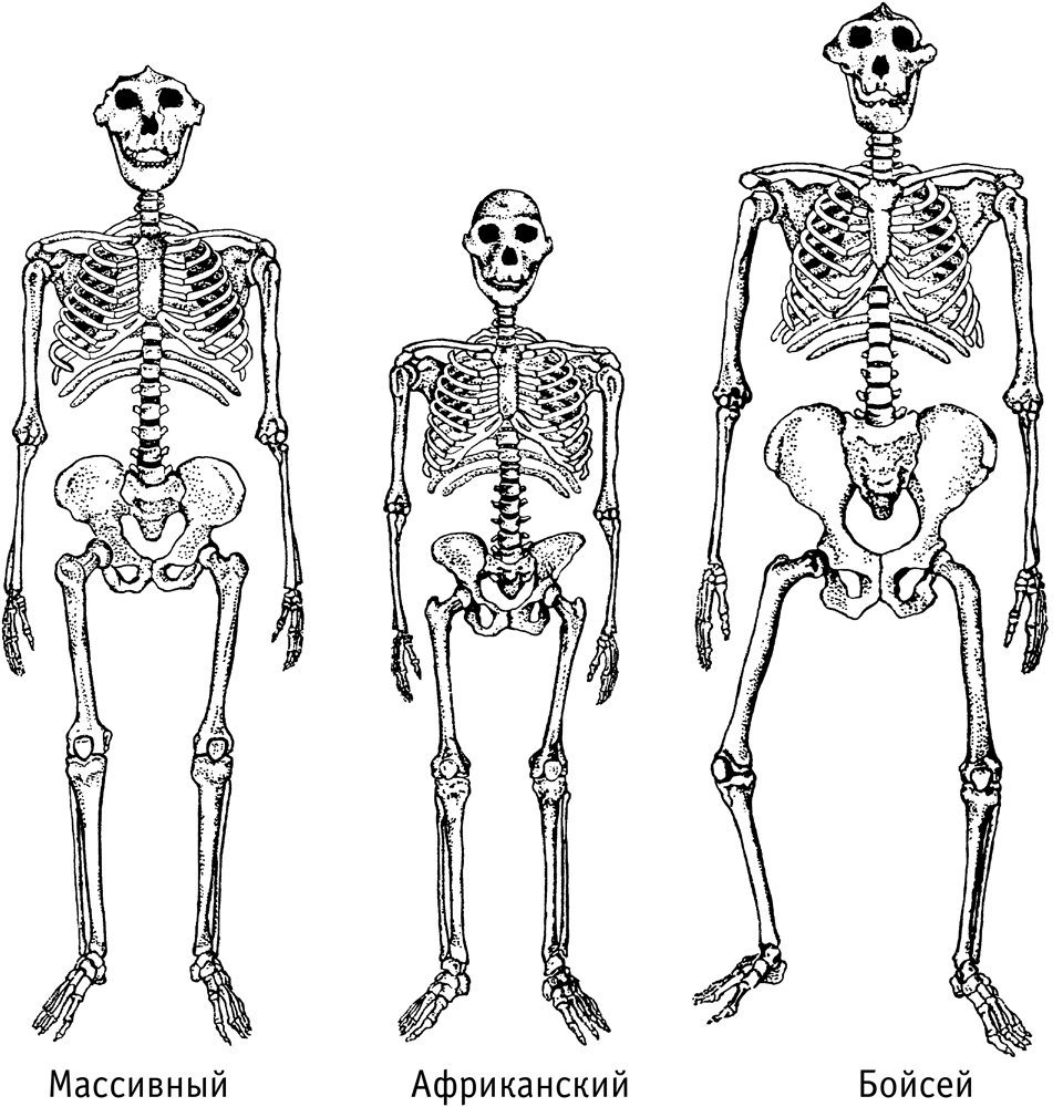 Это была не просто сенсация, это была революция: жившая 3 млн лет назад Люси ходила на двух ногах! От афарского австралопитека образовался целый кустик других видов австралопитеков. Последние из них вымерли всего лишь около 1 млн лет назад. Все австралопитеки ходили только на двух ногах, но каменных орудий не делали. Объем мозга у Люси и ее потомков был не больше, чем у современных человекообразных обезьян того же роста. Для того чтобы скелет четвероногой обезьяны преобразовался в скелет Люси, эволюции требуется 5–7 млн лет. Значит, гоминиды начали свой путь по Земле на двух ногах 8–10 млн лет назад. А первые каменные орудия имеют возраст 2,5 млн лет.