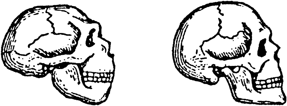 Череп позднего подвида прямостоящего человека (неандертальца, слева) и человека разумного (справа).