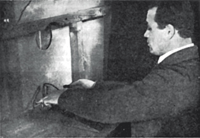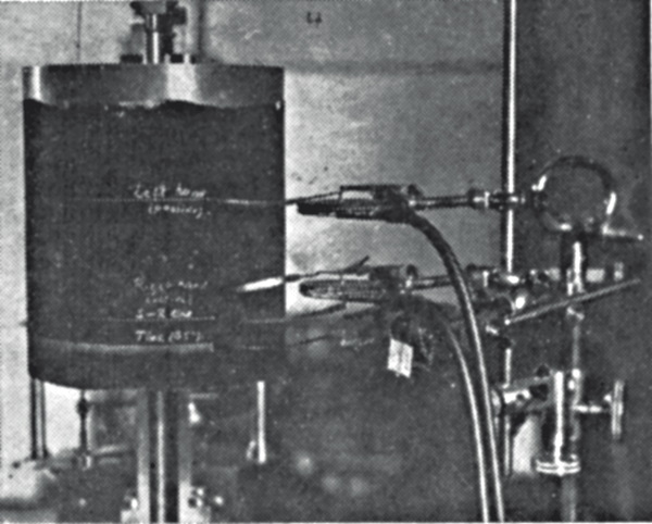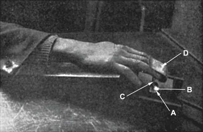 Наш испытуемый сидел в удобном кресле перед столом, держа свои руки на специальных пневматических приемниках. Правая рука лежала на столе, упираясь кончиками пальцев в зажим пневматического приемника, левая во время опыта держалась на весу, также упираясь пальцами в аналогичный аппарат (рисунок 2 изображает эту ситуацию).