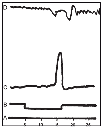 На ленте кимографа (вся регистрирующая часть установки дана на рисунке 4) мы получали, таким образом, запись, одновременно отражавшую три важных для наших опытов линии (мы приводим типичный отрезок на рисунке 5):