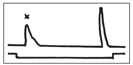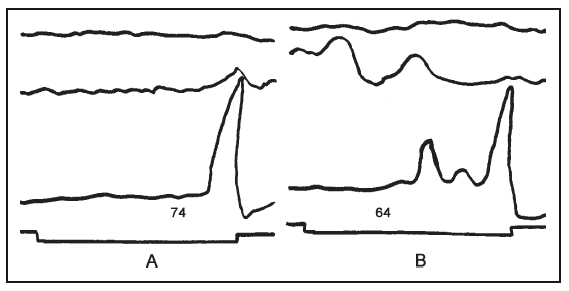 Отчет испытуемого показал, что первое пришедшее ему в голову слово «было неудобно произносить», он задержал его и сказал первое попавшееся ему после этого. Сопряженная моторная кривая дает достаточно точное отражение этой структуры: через 0,8" после подачи раздражителя мы получаем резкий моторный импульс, быстро тормозящийся, и только через 6" следует окончательная, соответствующая открытому речевому ответу, реакция.
