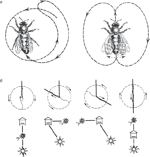 Рис. 2. «Танцы пчел» (по Фришу) а – направление движения пчел, б – отражение в «танцах пчел» основных географических координат