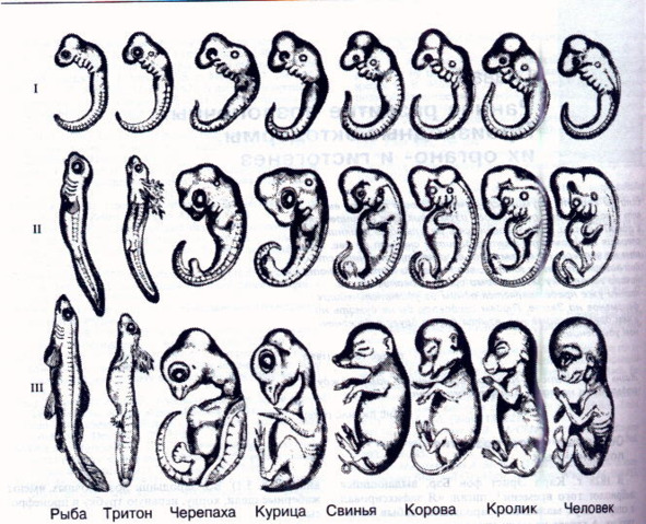 В сравнительной антропологии и эмбриологии центральное положение занимает закон Геккеля о повторении стадий развития эмбрионов животных в развитии эмбриона человека. Онтогенез – термин, обозначающий индивидуальное развитие конкретного представителя того, или иного биологического вида. Наглядной иллюстрацией этого закона может служить рисунок 1. По мере развития зародыши становятся узнаваемыми как член их класса, их отряда, их семейства и, наконец, их вида.