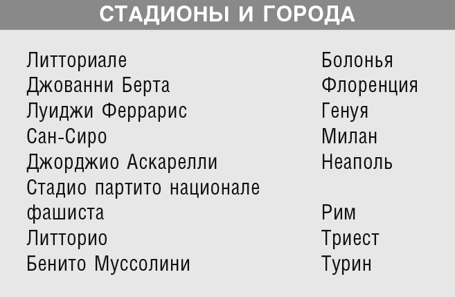 В отличие от 1930 года, когда все игры были сыграны только в Монтевидео, итальянцы разбросали матчи чемпионата по всей стране, сделав главным стадион в Риме.