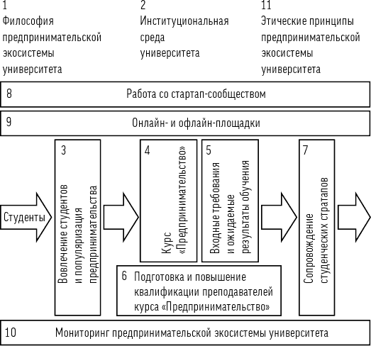 Рис. 1. Схема предпринимательской экосистемы университета и стандарты, соответствующие ее элементам
