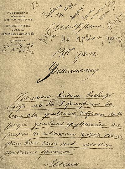 Телеграмма В. И. Ленина т. Уншлихту.
