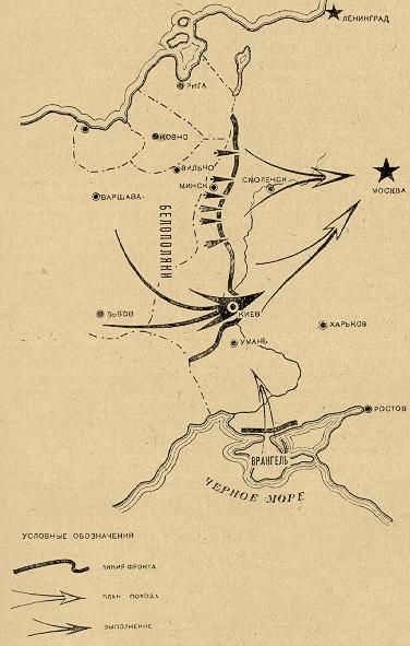 В противовес этой линии партии некоторые военные работники во главе с Троцким считали, что основной политической целью войны с нашей стороны является подталкивание, ускорение революции в Польше, привнесение в Европу революции извне, на штыках Красной армии. На западном фронте под влиянием этих троцкистских взглядов сложилась даже, как указывал старый большевик, покойный Степанов-Скворцов, лично побывавший в 1920 г. на западном фронте, своеобразная «новая военная школа», «для которой война просто средство быстрейшего продвижения, распространения революции». Без осуществления этой цели самое существование Советской республики и тем более победа социализма в нашей стране, остающейся в окружении капиталистических стран, казались Троцкому и его сторонникам невозможными. Вот почему Троцкий, в противовес утверждениям Ленина и Сталина, заявлял, что «польский фронт есть фронт жизни и смерти для Советской республики». В основе этих взглядов лежало все то же троцкистское неверие в возможность построения социализма в нашей стране, которому партия давала беспощадный отпор и в 1918 г. (в вопросе о Брестском мире) и в 1919 г. (весной – в вопросе о наступлении в сторону Венгрии в ущерб интересам южного и восточного фронтов; летом – предложение Троцкого о перенесении основного удара с восточного фронта на южный).