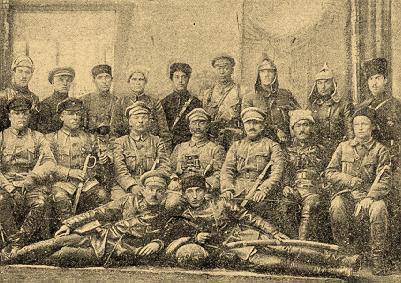 Командный состав I Конной армии. Стоят слева направо: 1) Военком 2-й кав. див. т. Грунин, 2) Нач. 2-й кав. див. т. Рожков, 3) Для поручений при командарме т. Дундич, 4) Нач. 14-й кав. див. т. Лебедев, 5) Военком 14-й кав. див. т. Блиох, 6) Комполка особ. назн. т. Горбачев, 7) Нач. 11-й кав. див. т. Степной, 8) Военком 11-и кав. див. т. Харитонов, 9) Наштадив 4-й кав. т. Косогов. Сидят: 1) Военком 6-й кав. див. т. Бахтуров, 2) Нач. 6-й кав. див. т. Тимошенко, 3) Член РВС I Конной армии т. Ворошилов, 4) Командарм I Конной т. Буденный, 5) Нач. Полештаба т. Зотов, 6) Нач. 4-й кав. див. т. Городовиков, 7) Военком 4-й кав. див. т. Детистов. Лежат: 1) Секретарь командарма т. Лакатош, 2) Секретарь члена РВС I Конной армии т. Максимиладзе.