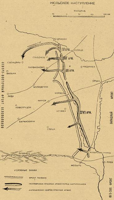 К началу июля западный фронт насчитывал около 100 тыс. бойцов против примерно 75 тыс. польских солдат. Превосходство для наступления на обороняющегося противника было незначительным, но командование западного фронта умело использовало это превосходство, образовав на правом своем фланге мощный кулак из трех армий [IV, XV (командарм т. Корк) и III] и конкорпуса под командованием т. Гая. План красного командования сводился к удару правым флангом наших армий по основным силам врага, с тем чтобы, обходя и тесня белополяков на юг, прижать их к пинским болотам.