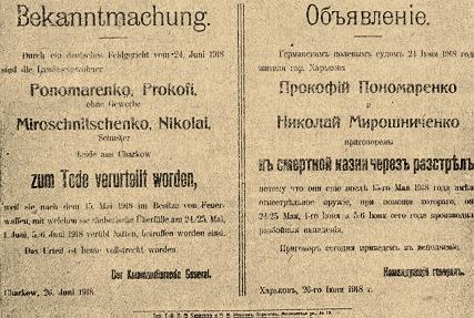 Ясно, что все это не могло не вызвать отпора со стороны рабочего класса и трудящегося крестьянства Украины. Под руководством подпольных партийных организаций, возглавлявшихся тт. А. С. Бубновым, С. В. Косиором, Я. Б. Гамарником, Г. Л. Пятаковым и др., по всей Украине прокатилась волна восстаний. Вооруженная борьба украинских рабочих и крестьян с интервентами, несмотря на террор австро-германских и гетманских войск, продолжалась в течение всех месяцев оккупации Украины немцами.