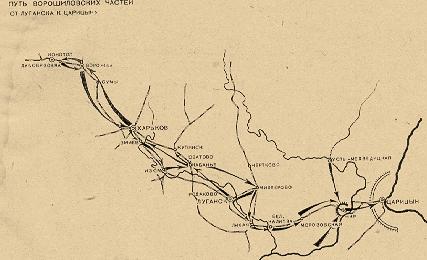 В то время как часть отступавших работала, остальные с оружием в руках отбивали налеты белых. Обороняли войска т. Ворошилова район работ и расположения эшелонов очень активно, не раз и сами переходили в наступление. Только благодаря образцово организованной обороне удалось т. Ворошилову к началу июля перебросить все до одного отряды со всеми эшелонами на левый берег Дона к Царицыну (ныне Сталинграду), где из них в дальнейшем была сформирована славная Х Красная армия. Тов. Ворошилов, руководитель похода с Украины к Волге, возглавил эту армию как ее командарм. За время этого замечательного похода выявилось немало отличных командиров, крепких большевиков, вместе с К. Е. Ворошиловым участвовавших и в дальнейшей борьбе с белыми. Товарищи Николай Руднев, Круссер, А. Я. Пархоменко, Харченко. Алябьев (командир бронечастей), Вадим, Межлаук, Худяков и многие другие именно в этот период определились как умелые боевые начальники. Многие из соратников Клима Ворошилова по этому походу (тт. Щаденко, Антонюк, Вайнер и др.) под его руководством сейчас работают в Красной армии на высших командных должностях.