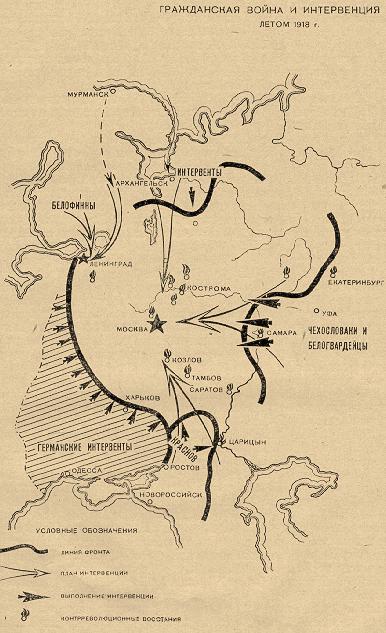Партии и советской власти было совершенно ясно, что захват Мурманска и Архангельска, Баку и городов Средней Азии, так же как и восстание чехословаков – все это являлось звеньями одной цепи, составными частями единого плана по окружению Советской России. Больше того. Очень скоро выявилось со всей очевидностью, что война с войсками Антанты, напавшими на Советскую республику извне, и война с контрреволюционными войсками, образовавшимися внутри страны, в сущности была единой войной пролетариата России с мировым империализмом. Конечно как у империалистов Антанты, так и у российских капиталистов, помещиков и кулаков были и свои особые интересы. Между ними существовали по отдельным вопросам и резкие противоречия. Например Англия стремилась к созданию на окраинах России (на Кавказе, в Средней Азии) мелких, полностью зависящих от нее «республик». Франция больше сочувствовала воссозданию единой России, но тоже полностью зависящей от французского капитала. Своя линия была у Японии и США. Но все эти противоречия на время отступали на задний план перед лицом победоносно развивавшейся пролетарской революции. Фронт Антанты и фронт внутренней контрреволюции представляли собой общий, хотя и не до конца единый антисоветский фронт.