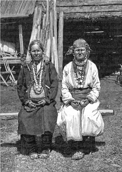 К сожалению, цивилизация вытесняет старинное искусство. К финнам проникают русские хлопчатобумажные ткани, и под влиянием православия черемиски стали считать украшение своей одежды грехом131, что привело к утрате ее исконных черт. В Паратах и в ближайших селениях вышивки из хлопковой нити темно–карминного цвета образуют геометрический рисунок – мелкие зубчики, расположенные полосками вокруг выреза на груди, рукавах и по подолу платья. По праздникам черемиски одевают рубахи с оттененными зеленым цветом вышитыми красными узорами. В других местах вместо хлопковых нитей используют шелковые132. Зимой мужчины и женщины носят длинные домотканые кафтаны, а по торжественным случаям черемиски одевают черное суконное пальто, украшенное широким отложным воротником с серебряными лентами, монетами и ракушками.