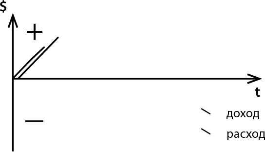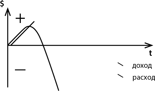 Вначале дела идут хорошо, и в этот период ты не замечаешь, как увеличиваешь свои обязательства: набираешь большой штат сотрудников, арендуешь больше помещений, берешь больше кредитов и больше товара под реализацию. Незаметно обязательства растут параллельно росту твоего дохода.