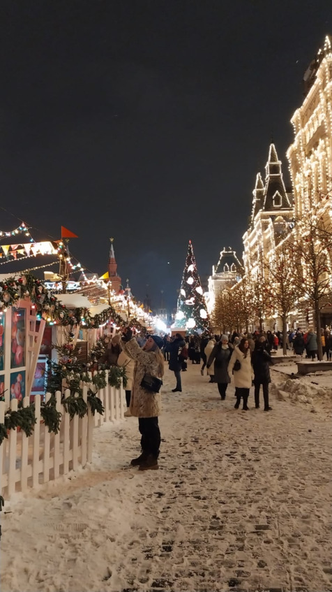Вскоре мы вновь оказываемся на Красной Площади самого большого города самой большой Страны. Внутри атмосферы народного гуляния находится ярмарка с товарами от кондитеров и ремесленников. На открытом воздухе, среди радостных людей, фотографирующих виды окружающего мира, моё настроение кардинально меняется. На лице Умы открывается улыбка. Взирая на мягкие снежинки, улыбаюсь и я.
