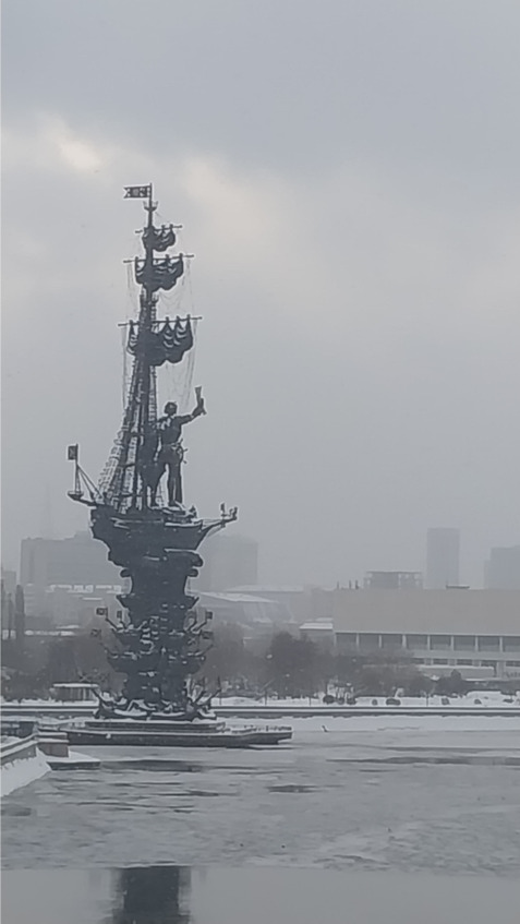 Вдали виднеется огромный памятник императору Петру 1. Он на постаменте в полный рост управляет кораблём, устремлённым по волнам истории к величию России.