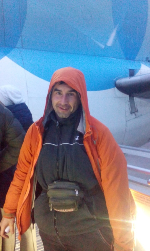 Жареный петух клюнул, когда уже началась посадка. С удивлением констатировал, что тело не принадлежит мне. Руки сами доставали вещи из рюкзаков, складывая крупные в один с Победовскими габаритами, а мелочь рассовывая по имеющимся и пришитым карманам в двух флисках, куртке, и двух тёплых штанах. Да так чётко, что делай я это разумно, потратил бы уйму времени. А так, всё действо уложилось буквально в двадцать минут. Палатка с карематом, в заключение, пролегли из одного рукава по спине в другой рукав, создав логический объём, уравновешивая оттопыренную поясничную часть (из-за забитых карманов содержимым двух лишних рюкзаков). Вот как это в итоге выглядело со стороны.