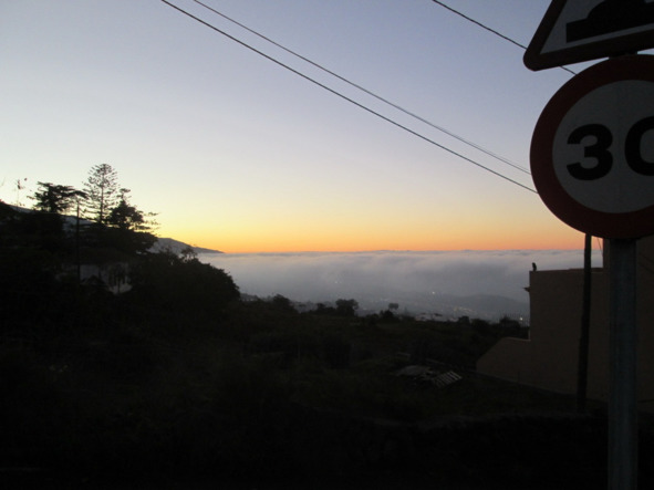 Ведь действительно, на эти 10 километров ушло 5 часов. Ситуацию осложняла болезнь. Хоть уже хорошо всё отходило, нельзя было застудиться, чтобы не пришёл песец. Поэтому работал на износ, полз очччень медленно, останавливаясь, лишь чтобы отдышаться. В эти мгновения удавалось ухватить шикарнейший пейзаж за спиной. Словно спрут подтягивали свои щупальца облака, пока не скрыли под своим одеялом всю Ла-Оротаву. А по всему горизонту продолжал играть разноцветными красками закат. Наклон улицы был такой, что моя машина точно бы не поднялась, даже и по асфальту (после Грузии я это легко теперь определяю). В итоге взмок так, что наверное наверху можно было бы отжать.