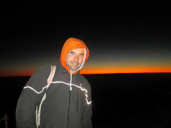 Потом подтянулась группа Украинцев, которая маячила фонарями сзади. Коммерция всегда подстраивается под самых слабых, поэтому профи, не стесняясь в выражениях проклинали своё попадание в это стадо. По этой причине сам организовываю и реализую свои трипы. Последней прибежала группа Норвежских студентов. Подруга Украинца сразу замёрзла, а я как раз разогрел и внутренности и одежду, поэтому отдал ей одну флиску и штаны. Она сначала не поверила своим глазам. Но, видимо, замёрзла настолько, что приняла, а одев всё, сразу повеселела на вид. Попросил одного норвежца сфотать меня с вулканом, ибо было уже светло. В итоге он сделал целую фотосессию.