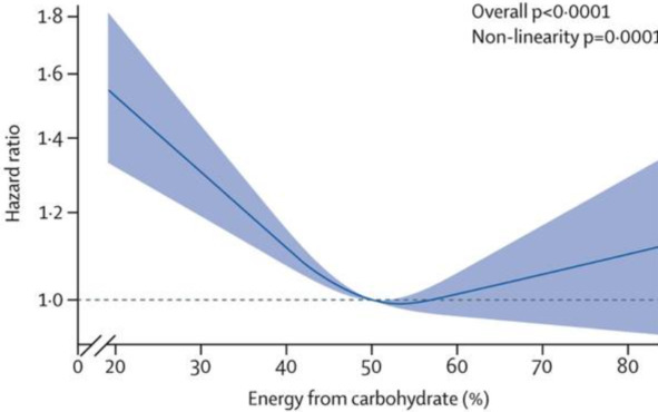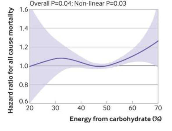 В проспективном когортном исследовании и метаанализе [1] учёные изучили связь между процентом энергии от потребления углеводов и смертностью от всех причин у 15,5 тыс. людей в течение 25 лет. При этом минимальный риск наблюдался при 50—55% энергии из углеводов.