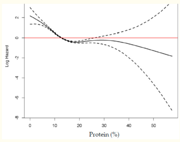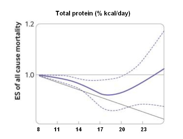 В метаанализе [4] исследовалась связь потребления белка со смертностью. Хотя данные имеют значительный разброс, можно оценить, что оптимум лежит в области 17—20% суточного калоража.