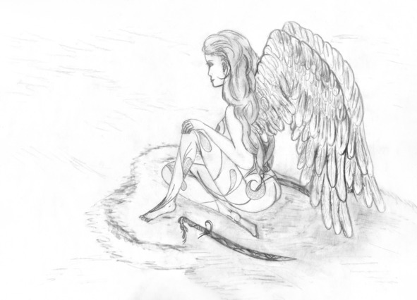 Так они прошли коридор до конца, который упирался в дверь ещё одной комнаты. Ключом была открыта дверь, и они вошли – вернее Ситарель вошёл, а Малэ втащили. Комната была маленькая – одна стена, где была дверь, через которую они вошли, две напротив друг друга полностью прозрачные и четвёртая глухая. На ней была картина, изображающая в профиль грустную девушку. Девушка сидела подобрав ноги на камне с раскрытыми крыльями. Закат на картине своими оттенками придавал камням на песке странный кроваво-красный цвет, а её лицу – лихорадочный румянец и стекал кровавыми разводами по её серебряным крыльям и лианам на её теле. Тени от камней плавно сгущались к пропасти на заднем плане, как будто тонули в ней. Рядом с ней лежали знакомые клинки. Казалось, она живая, ещё немного – и повернёт голову к ним. Но нет – её глаза смотрели куда-то вдаль, и она была всего лишь девушкой, изображённой на картине.