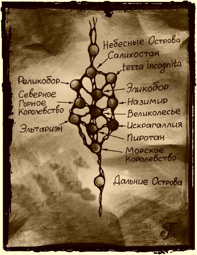На одной из страниц она нашла странную и запутанную схему расположения дверей, соединёнными между собой в хаотичном порядке. В каждое королевство можно было попасть из трёх или четырёх других. И только на Дальних и Небесных островах было по одной двери.