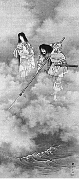 В начале, если верить «Нихон сёки», «когда Небо-Земля были не разрезаны, и инь-ян не были разделены, мешанина [эта] была подобна куриному яйцу, темна и содержала почку.