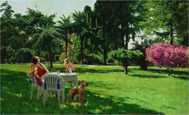 Здесь, на картине художника Юрия Сергеева «Мысли» дама сидит, и ломает голову над самыми разными вещами (в голове у каждого из нас всегда какие-то проблемы), вместо того, чтобы просто радоваться солнцу, теплу, зелени, пению птиц.