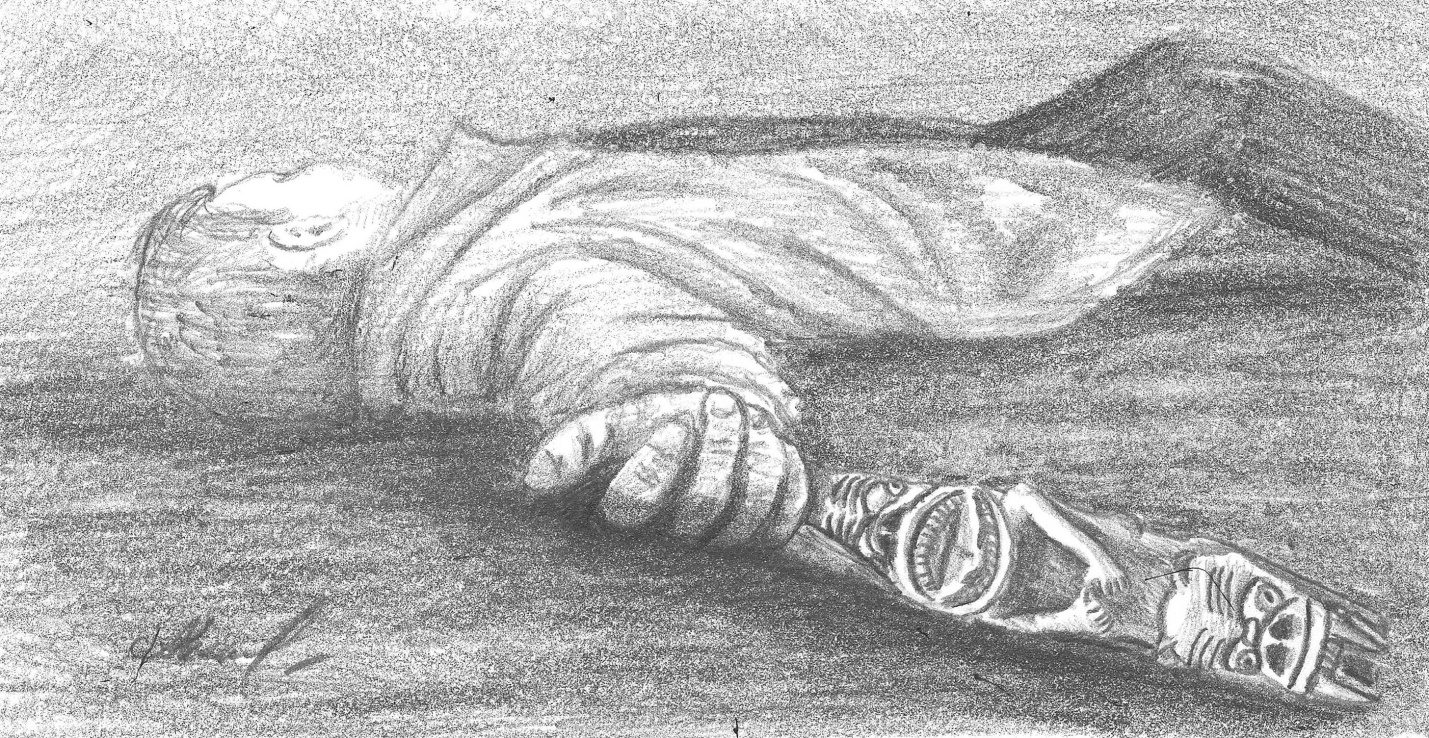 – А это что такое милое? – Джулиан поднял с земли маленькую костяную фигурку, изображавшую странное существо с конусообразной головой, открытым зубастым ртом и ушастой клыкастой мордой вместо ног.