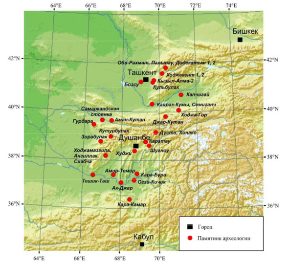 Карта расположения палеолитических объектов на территории Западного Памиро-Тянь-Шаня [134, с. 19]