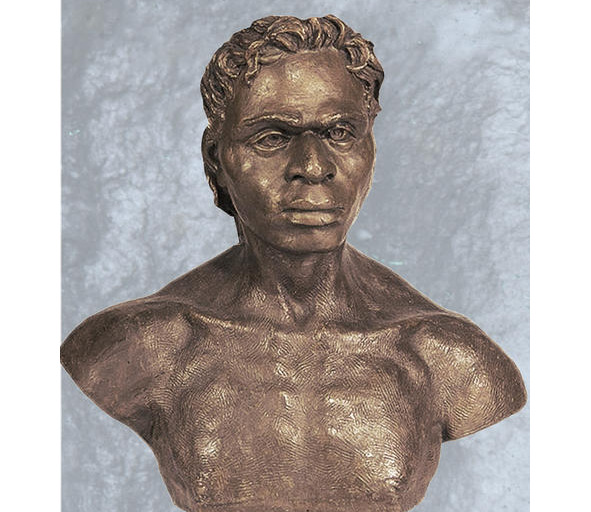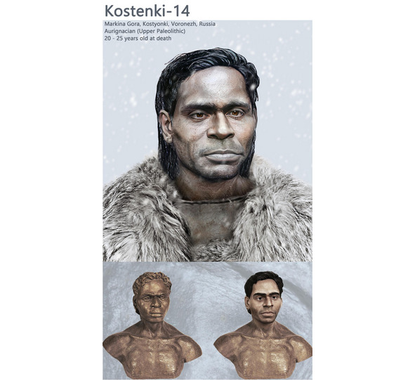 Реконструкция внешности человека Костёнки-XIV. Автор: М. М. Герасимов (фото: МАЭ РАН) и портрет в цвете, выполненный художником Philip Edwin [227].