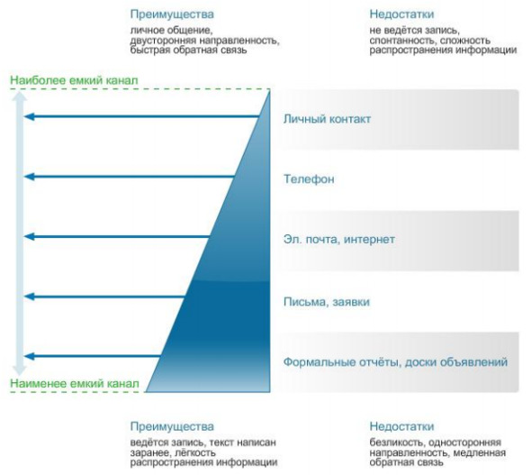 Как было отмечено выше, главная цель коммуникации – обмен различного рода информацией. Каждая организация пронизана сетью информационных каналов, которые предназначены для её сбора, анализа и систематизации. Менеджер имеет возможность выбирать наиболее удобные для него каналы коммуникации с другими руководителями и рядовыми сотрудниками. Обсудить проблему можно в личной беседе, по телефону, написав электронное сообщение, записку или письмо, либо повесить сообщение на доску объявлений – конкретный канал во многом определяется природой сообщения.