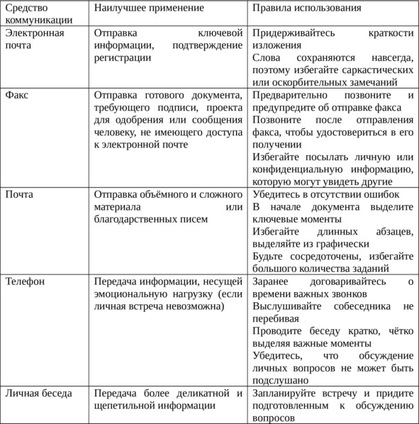 В любом случае важен не только вопрос, какую форму коммуникации выбрать, но и как ее правильно использовать. В табл. 2.1 приведён ряд полезных советов по использованию традиционных средств коммуникации [20, с. 411].