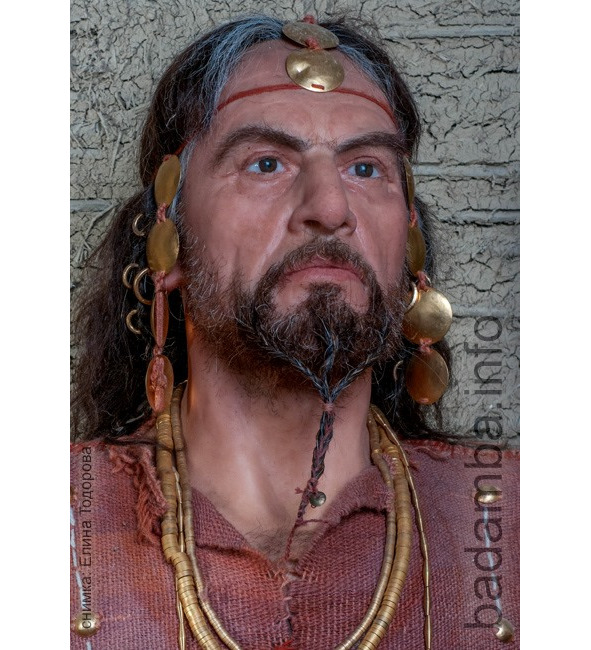 На рис. вождь-жрец (возраст 40—45 лет) из некрополя Варна (4600—4300 гг. до н.э.) на северо-востоке Болгарии. Вместе с ним найдена самая ранняя крупнейшая в мире коллекция золотых артефактов весом более 1,5 кг [249]. У него определены Y-ДНК гаплогруппа T-M184 [288] и мтДНК-гаплогруппа U2 [258].