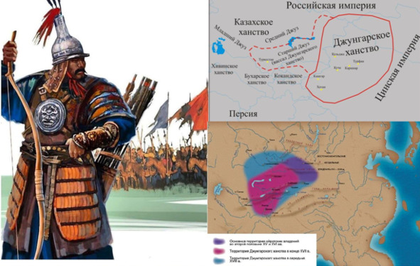 Джунгарское ханство (1635—1758) занимало территорию от Тибета, и Китая на юге до Сибири на севере и от оазисов Сырдарьи на западе до Халха-Монголии на востоке, включая озеро Балхаш, Семиречье, озеро Кукунор, горы Тянь-Шань, Алтай, долину реки Или, верховья Оби, Иртыша, Енисея и пр.