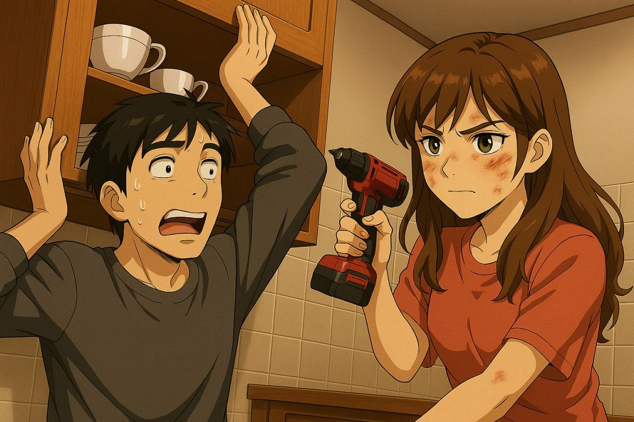 Я держал шаткую конструкцию, пока она ловко орудовала шуруповёртом. Язык торчал из уголка рта – её