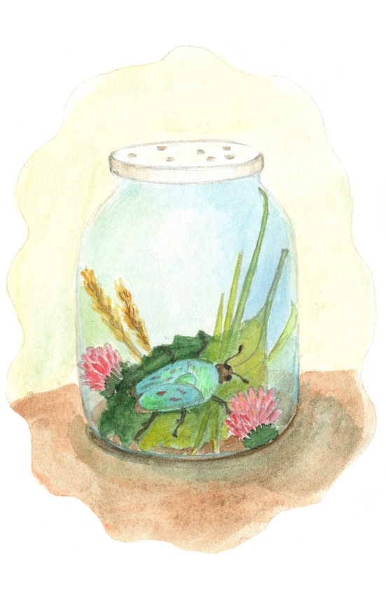 Посадили мы его в стеклянную банку и в крышке ножиком дырочки проковыряли, чтобы воздух входил. Сидим, разглядываем. А жучище солидный был. Размером с большую пуговицу. Усище длинные, брюшко светлое, а спинка тёмно-зелёная с бордовыми крапинками.