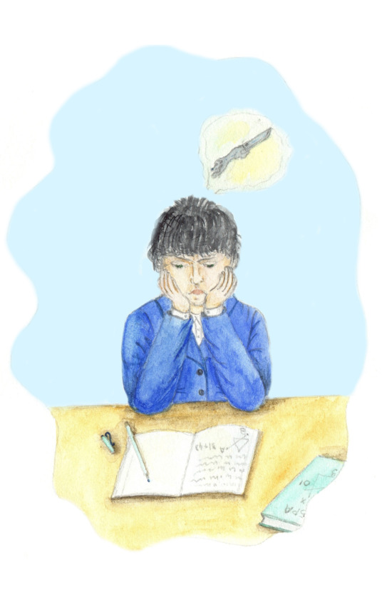 Сунул я руку в карман, сжал ножик в кулаке. И как только дотронулся до него, снова расхотелось мне отдавать его Саньку. Но тут совесть кольнула меня в бок посильней, достал я тогда ножик и выложил на парту перед Саньком. А Санёк и не видит, всё в окно смотрит, словно окаменевший.